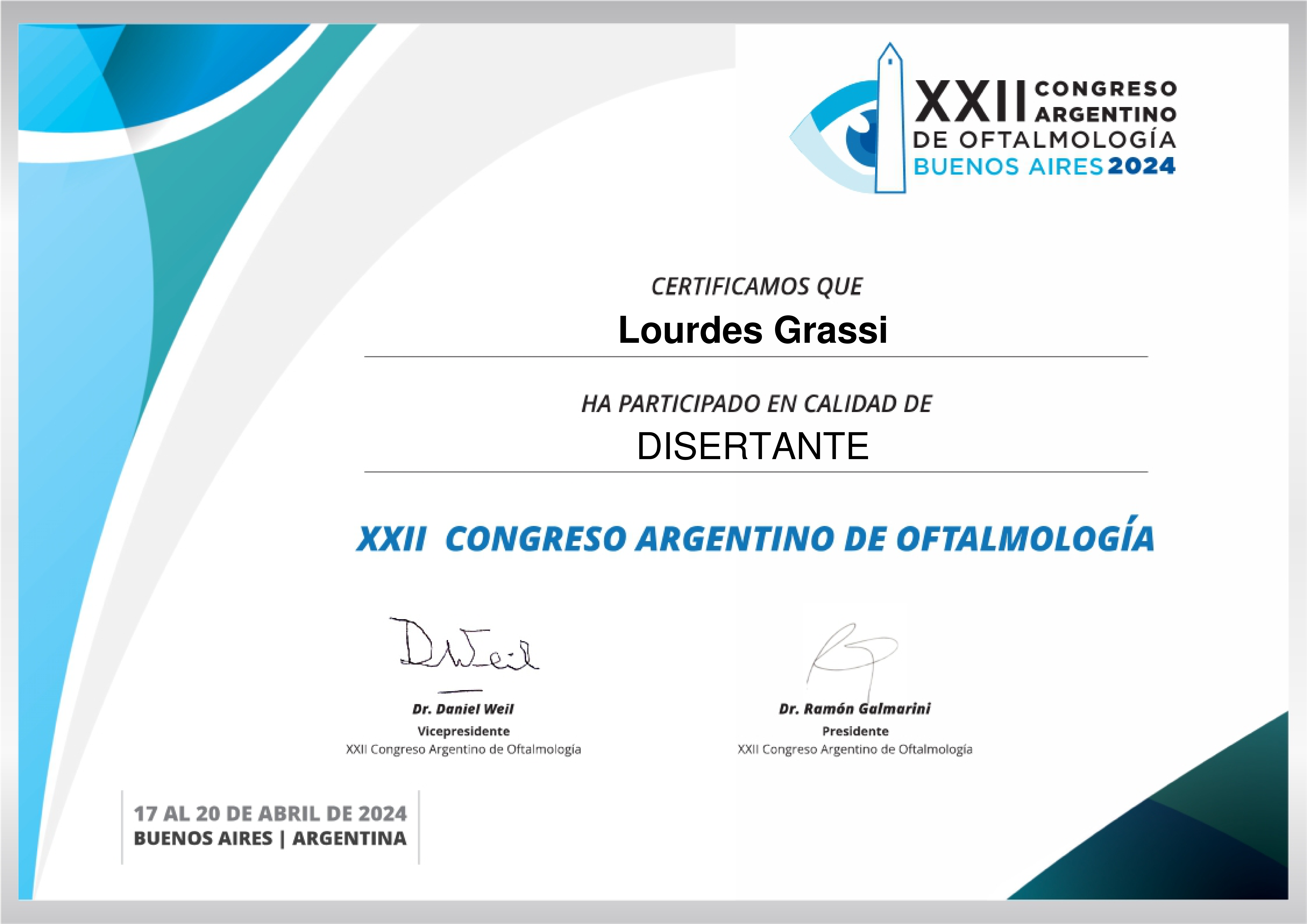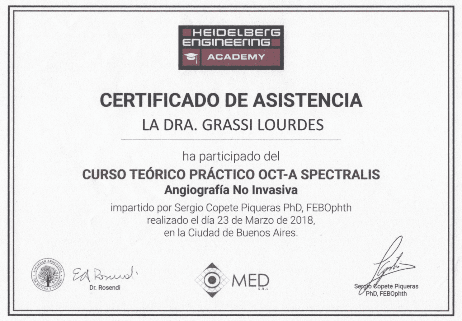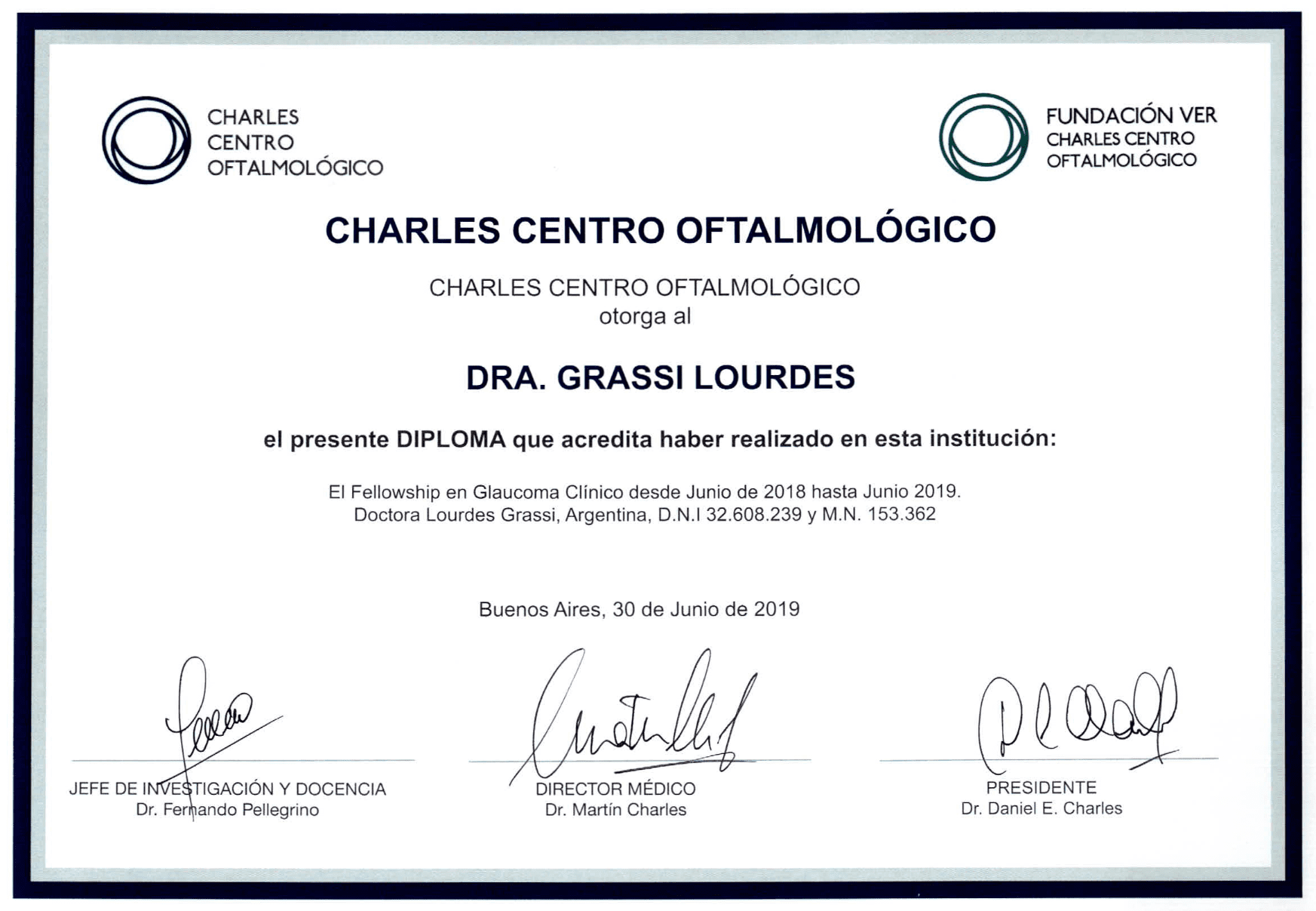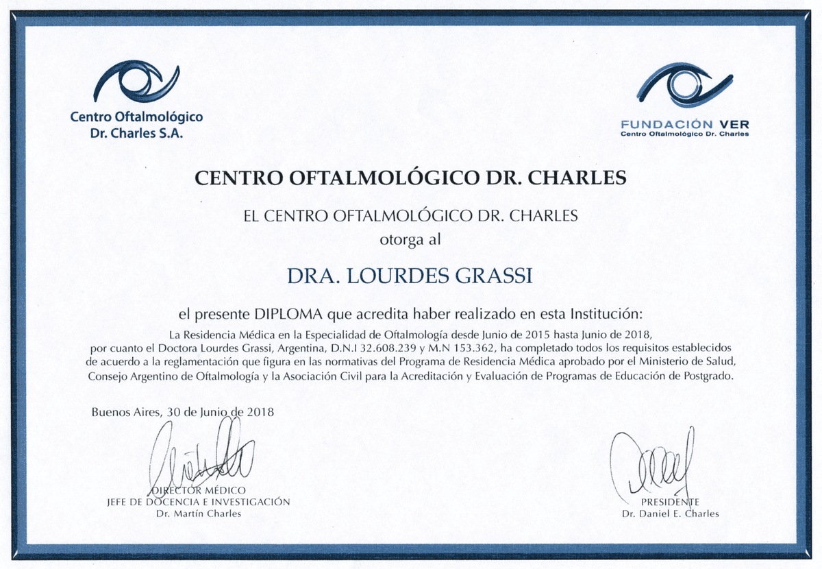 Graduated from Medical School from the University of Buenos Aires (UBA). Completed the three-year residency program in Ophthalmology at Charles Ophthalmological Center, while obtaining the Ophthalmology degree from University del Salvador. Once the residency was completed, I continued working at Charles Ophthalmological Center as chief resident and simultaneously worked as a helper in the consulting room with Dr Martin Charles in clinical retina.