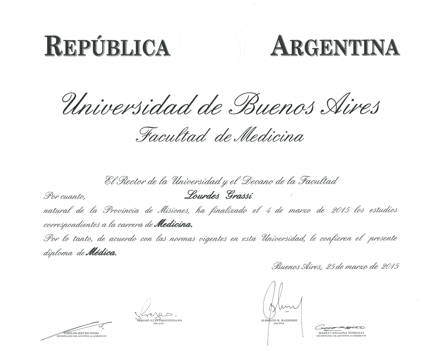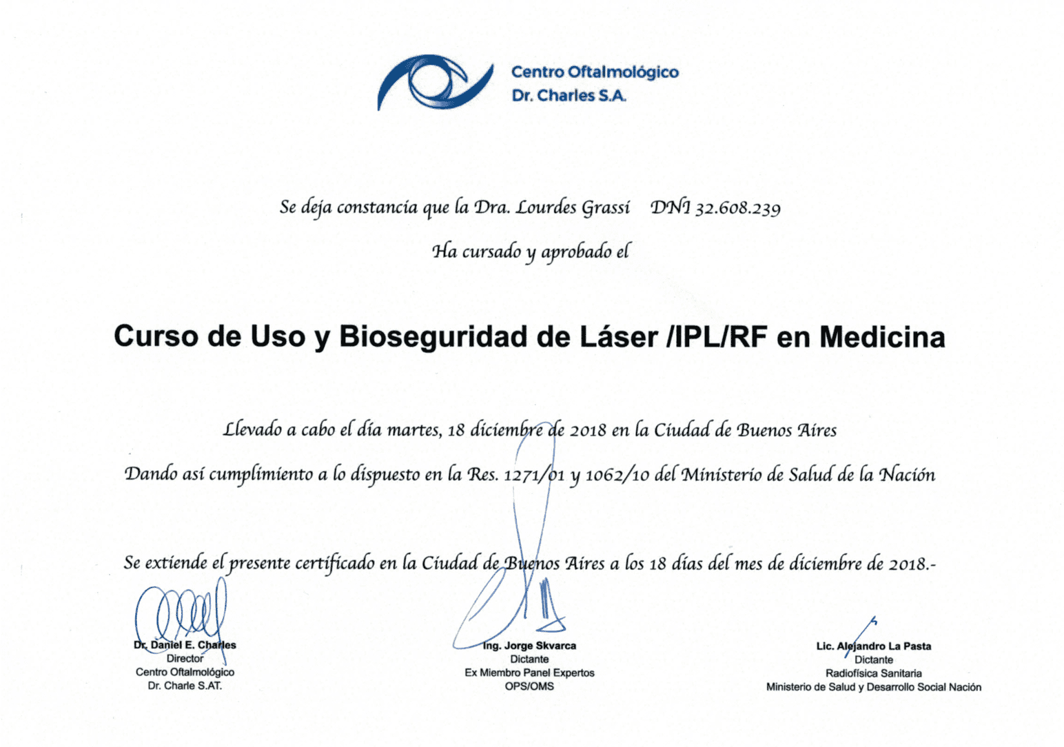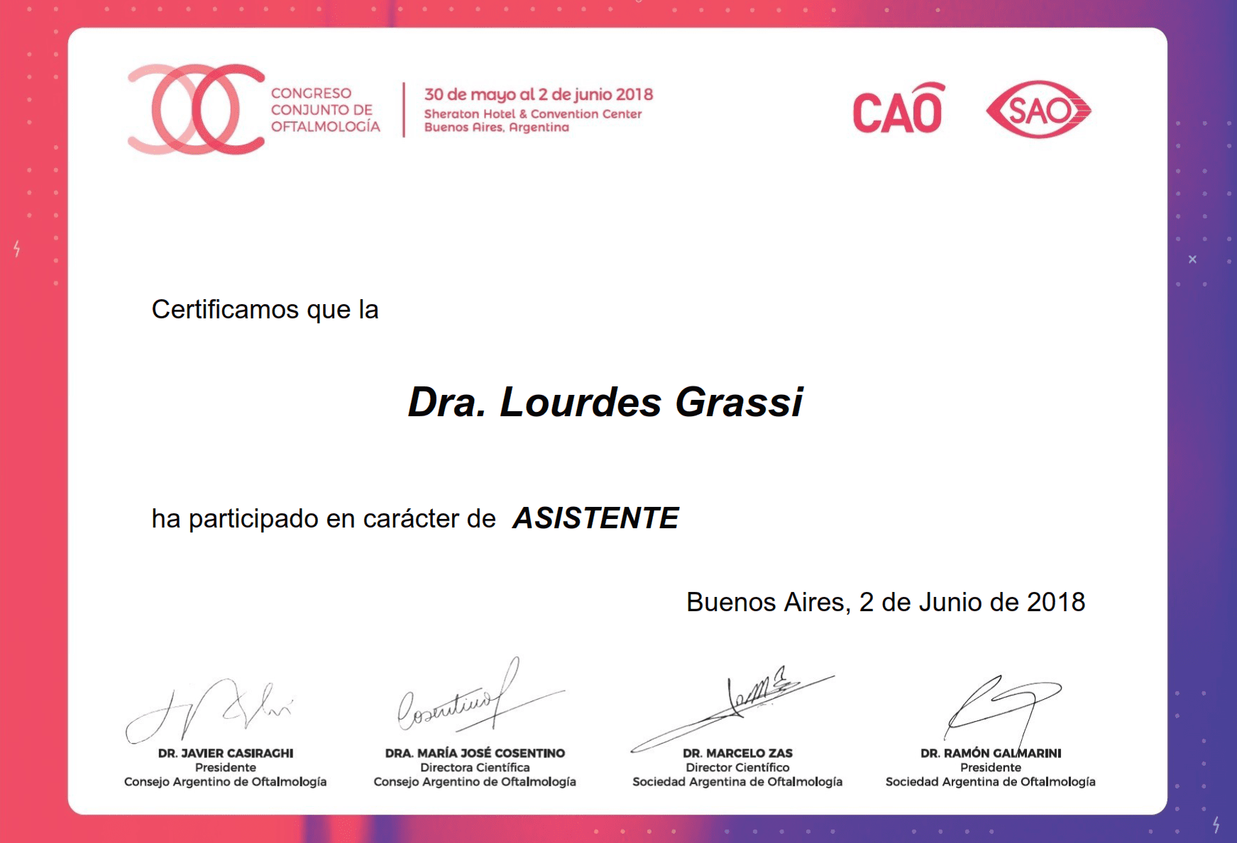 Graduated from Medical School from the University of Buenos Aires (UBA). Completed the three-year residency program in Ophthalmology at Charles Ophthalmological Center, while obtaining the Ophthalmology degree from University del Salvador. Once the residency was completed, I continued working at Charles Ophthalmological Center as chief resident and simultaneously worked as a helper in the consulting room with Dr Martin Charles in clinical retina.