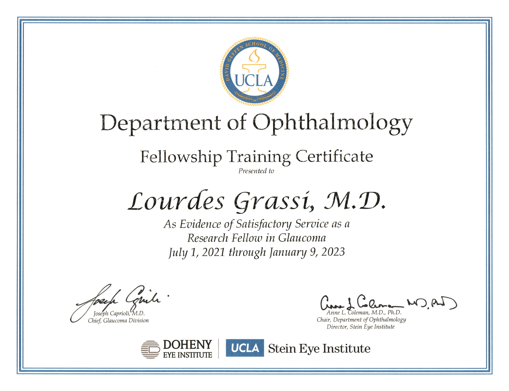 At present, I finished a Glaucoma Research fellowship at UCLA under the direction of Dr. Joseph Caprioli and started working again at Charles Ophthalmological Center.